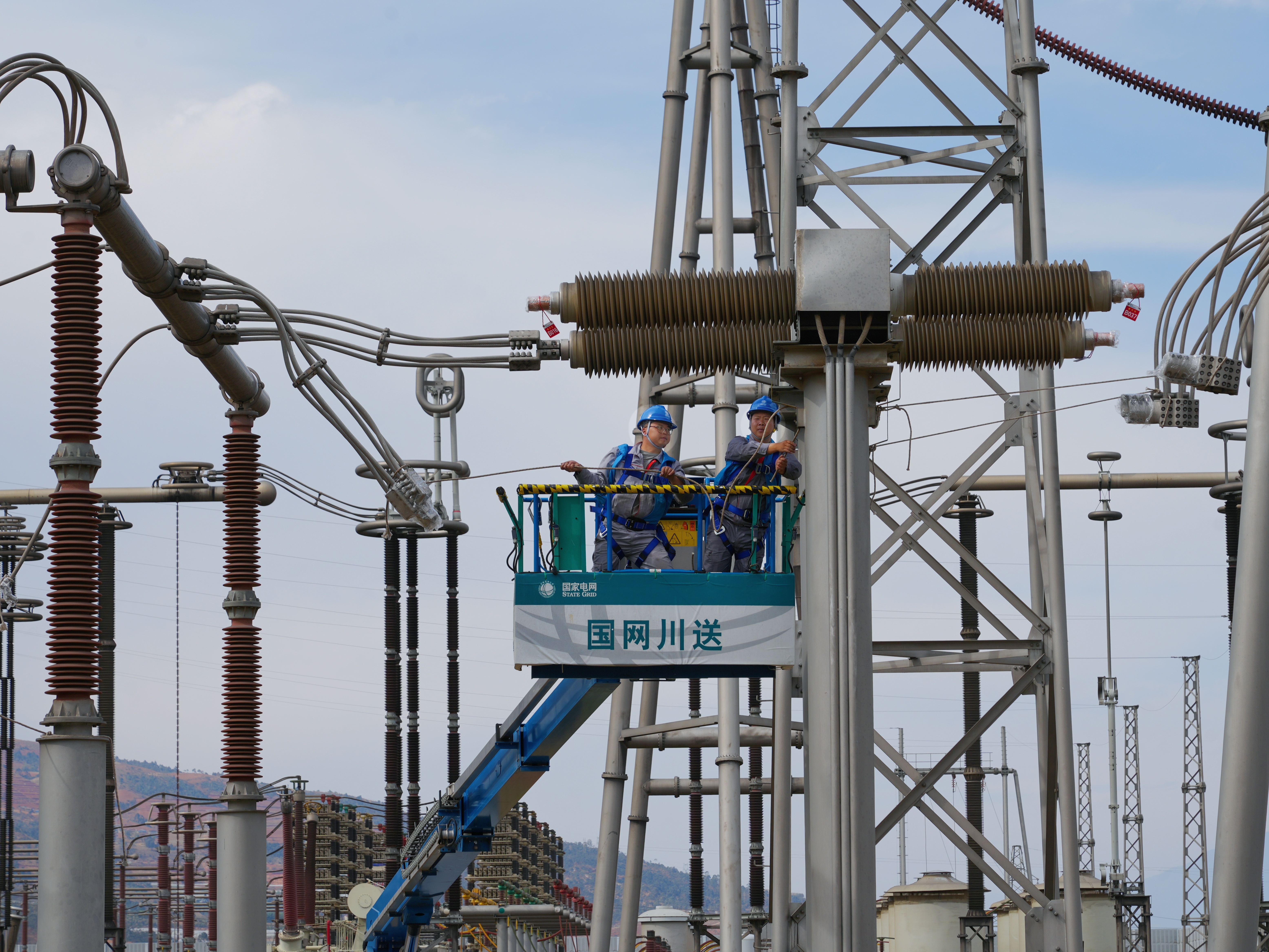 国网四川送变电公司工作人员在±800千伏锦屏换流站直流场区域开展检修。该站是锦屏—苏南±800千伏特高压直流输电工程的送段换流站。(王娇 摄