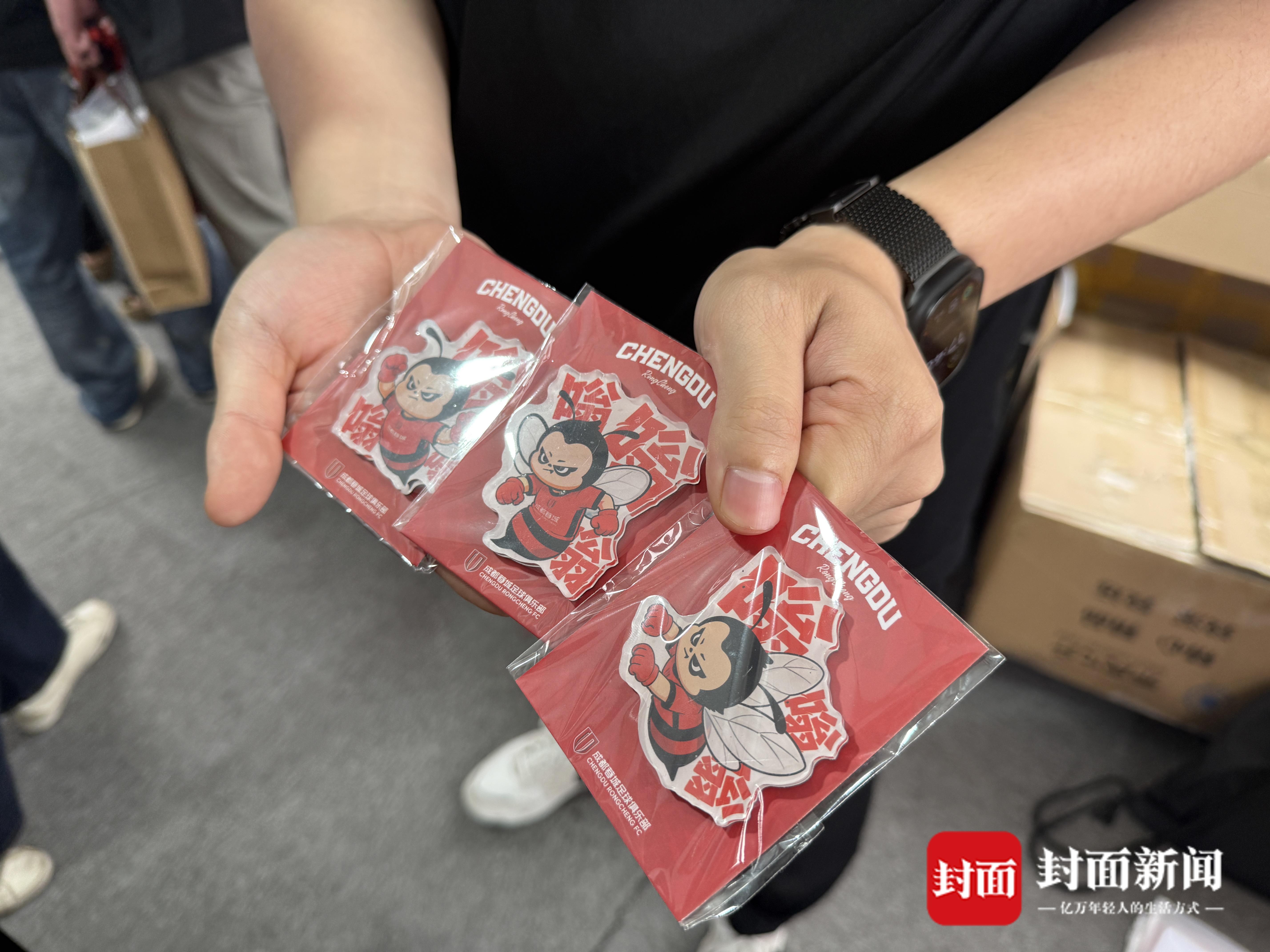 球迷,是最能感受到消费变化的群体。“现在我们的消费场景也变多了,我们会在周边餐馆请外地球迷聚餐,也会购买很多周边。”陈达说,今年他已经在购置主队周边上花费1000多元了。在他身旁,成都蓉城足球俱乐部球迷服务部负责人谭佳均拿着一件印有蜜蜂图案的短袖T恤介绍:“这是我们根据外地球迷调侃热梗设计的专属助威服,也是销量很好的一款周边。”